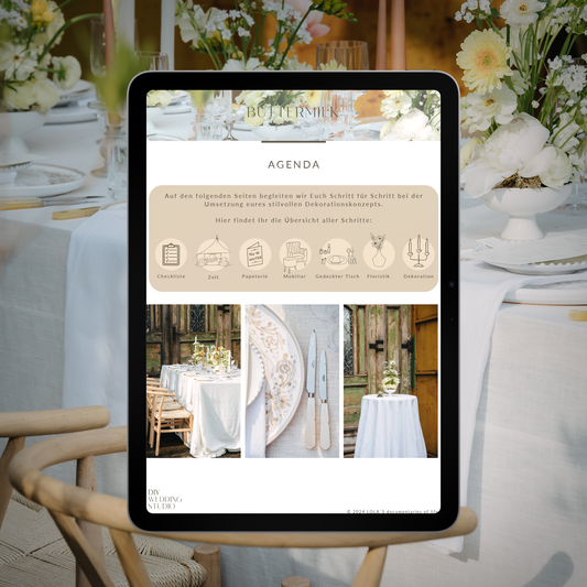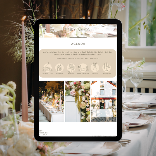 Bei DIY WEDDING STUDIO findest du dein individuelles Hochzeitsdesign – ganz einfach per Klick! Wir begleiten dich Schritt für Schritt, damit du dein Traumkonzept professionell umsetzen kannst. Unsere PDF-Anleitungen bieten dir nicht nur eine klare Anleitung, sondern auch direkte Links zu allen benötigten Produkten, Möbeln und der Floristik. Zusätzlich liefern wir dir hilfreiche Tipps zur Papeterie sowie alternative Vorschläge bei Schlechtwettervarianten damit dein großer Tag perfekt wird.