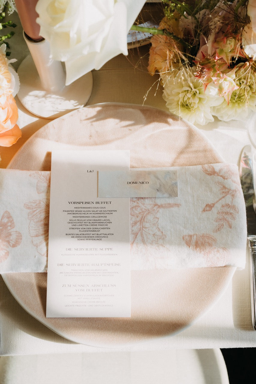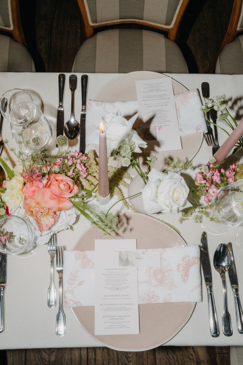 Für die Umsetzung dieses Konzepts solltet Ihr mit Kosten ab 80€ pro Person rechnen. Hier sind alle Elemente der Tischdekoration wie Floristik, Papeterie, Kerzen, Geschirr, Besteck und Tischwäsche enthalten. Weitere Komponenten wie Mobiliar oder besondere Extras sind im Guide verlinkt, aber nicht in diesem Preis enthalten.
