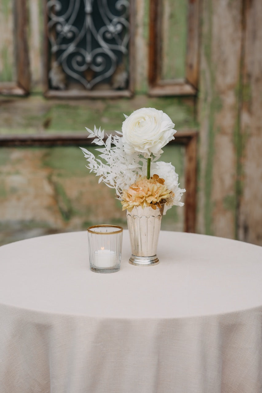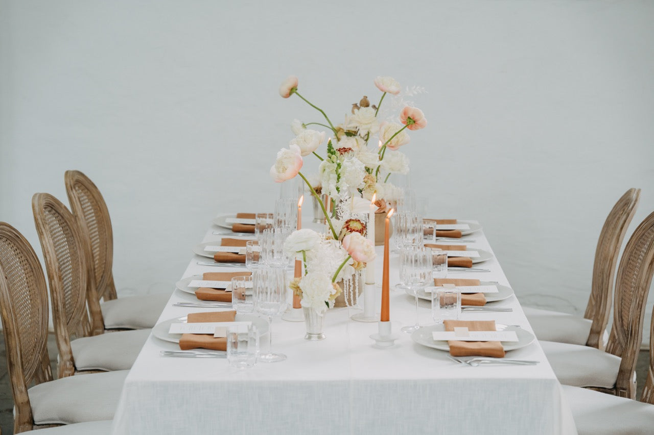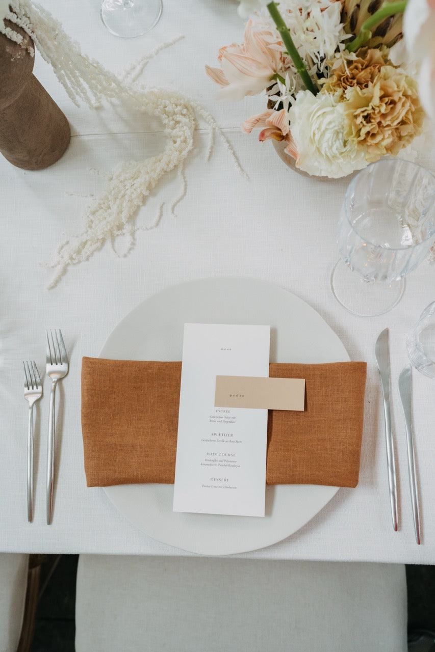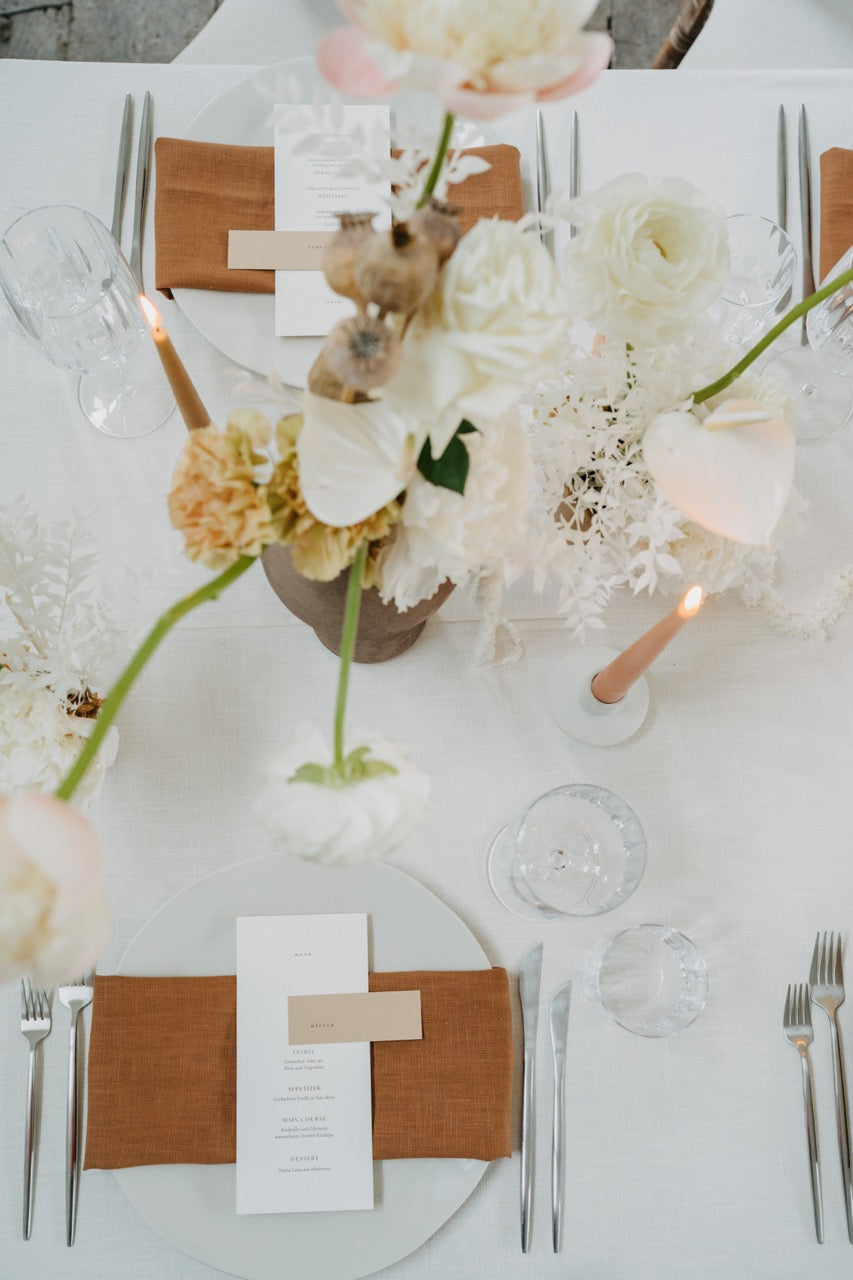 Für die Umsetzung dieses Konzepts solltet Ihr mit Kosten ab 74€ pro Person rechnen. Hier sind alle Elemente der Tischdekoration wie Floristik, Papeterie, Kerzen, Geschirr, Besteck und Tischwäsche enthalten. Weitere Komponenten wie Mobiliar oder besondere Extras sind im Guide verlinkt, aber nicht in diesem Preis enthalten.