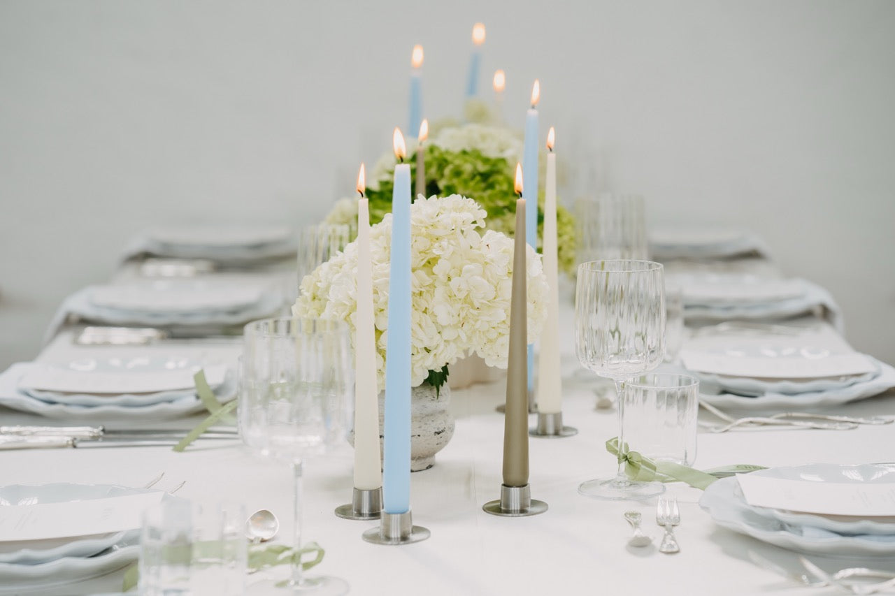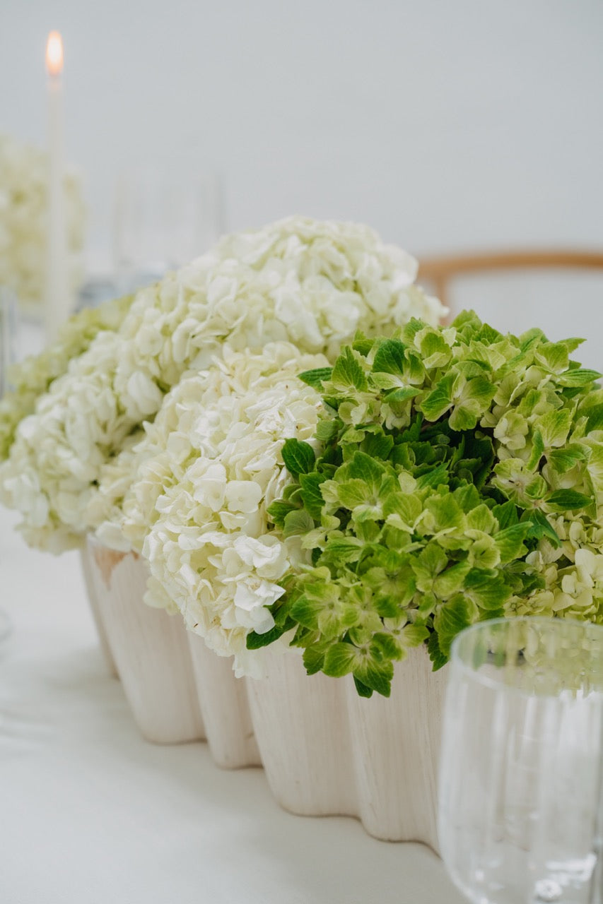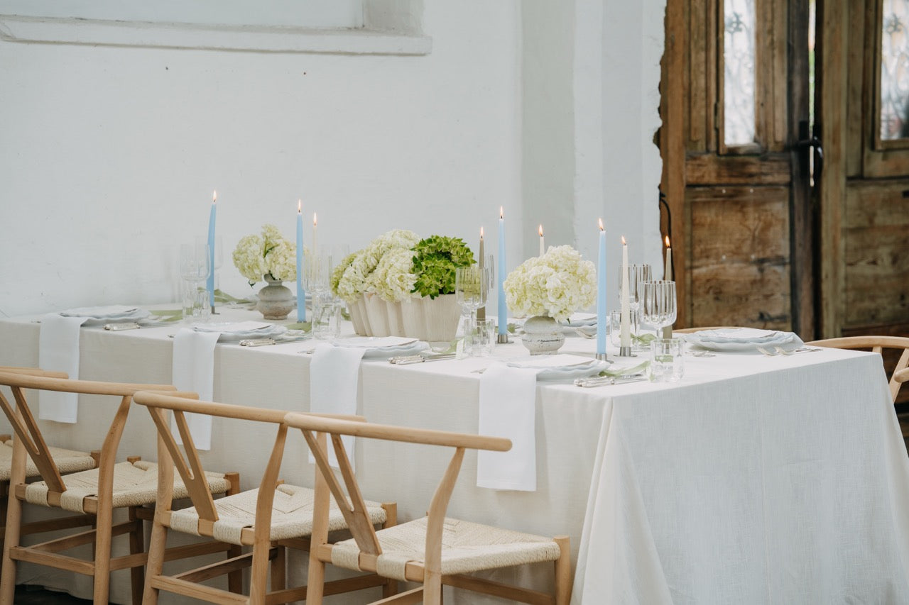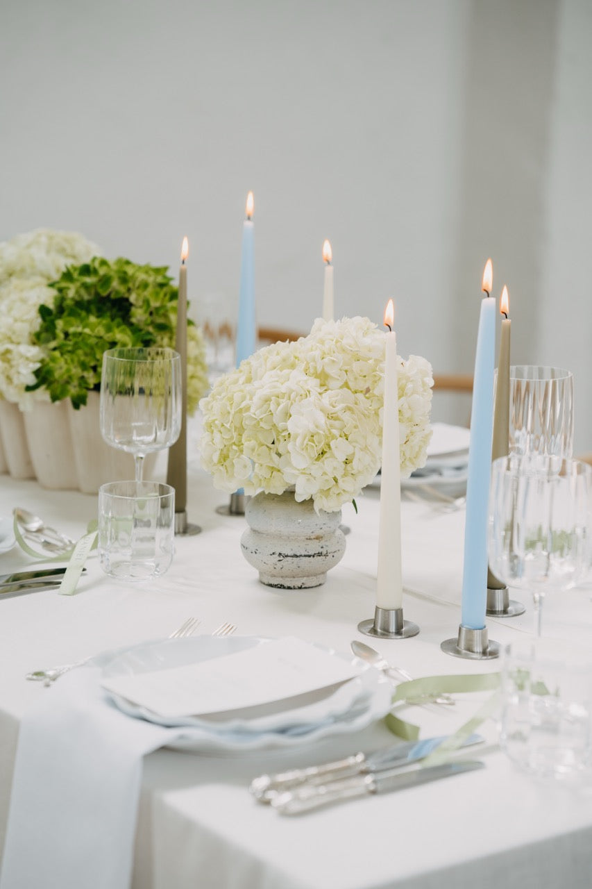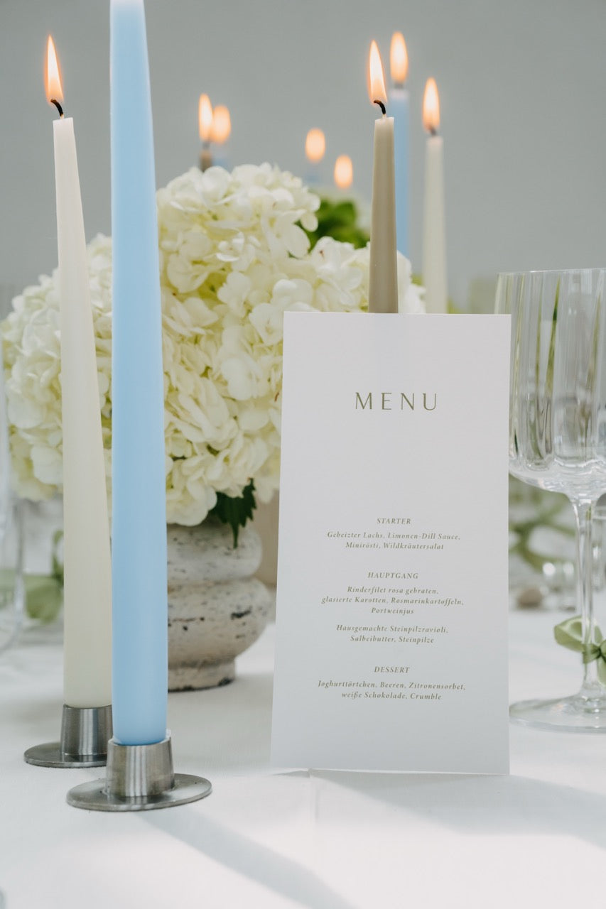 PURE steht für moderne Eleganz in ihrer klarsten Form. Der Look ist reduziert, durchdacht und dennoch voller Wirkung. Die harmonische Kombination aus frischem Weiß, sanftem Grünton und dezenten Akzenten in Pastellblau erzeugt ein ruhiges, fast schwereloses Gesamtbild. Opulente Hortensien in abgestimmten Gefäßen treffen auf gradlinige Kerzenhalter und zarte Texturen – alles wirkt leicht, stilvoll und ausgewogen. Dieses Konzept lebt von seiner minimalistischen Raffinesse und der Kunst, mit wenigen, hochwertigen Elementen eine besondere Atmosphäre zu schaffen. PURE fühlt sich aufgeräumt, luftig und gleichzeitig besonders an – perfekt für alle, die sich nach Klarheit, Stil und feiner Zurückhaltung sehnen.