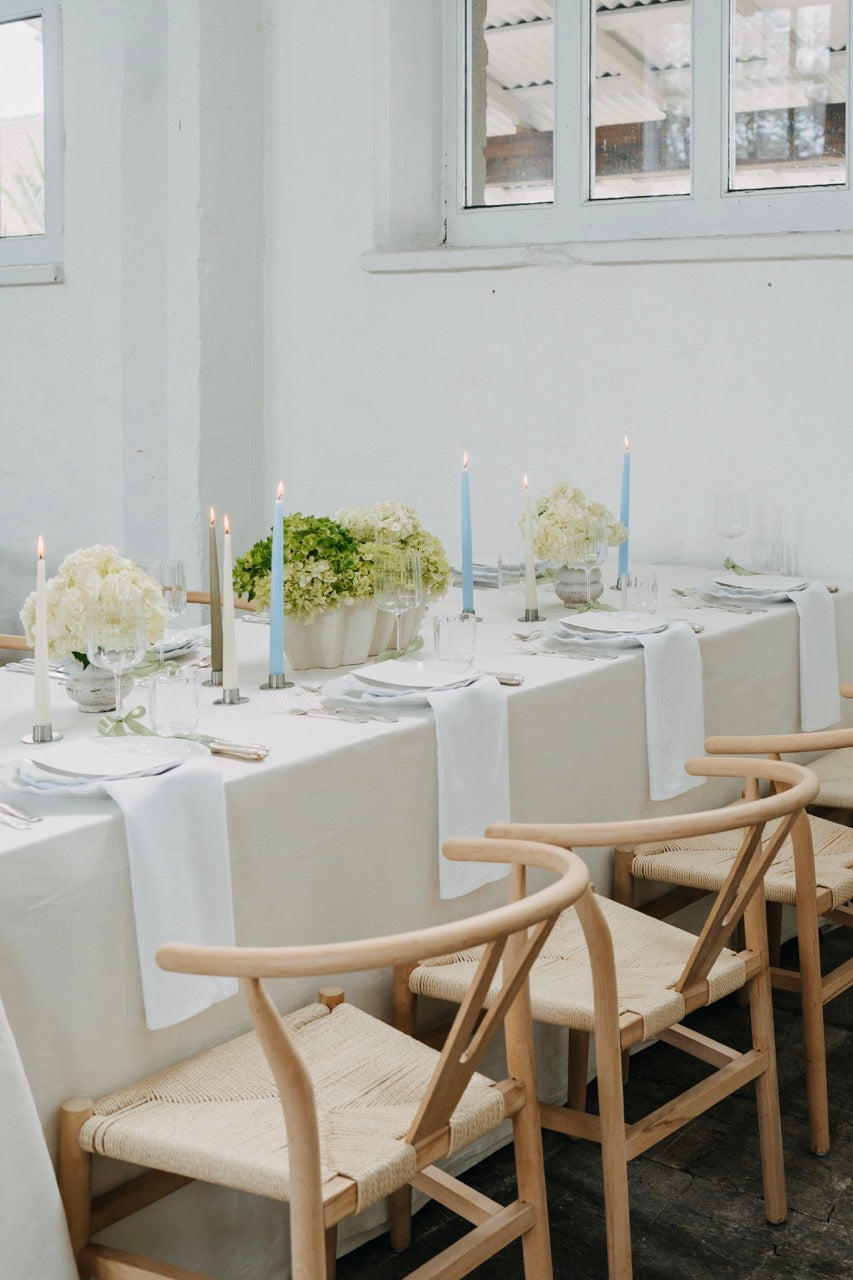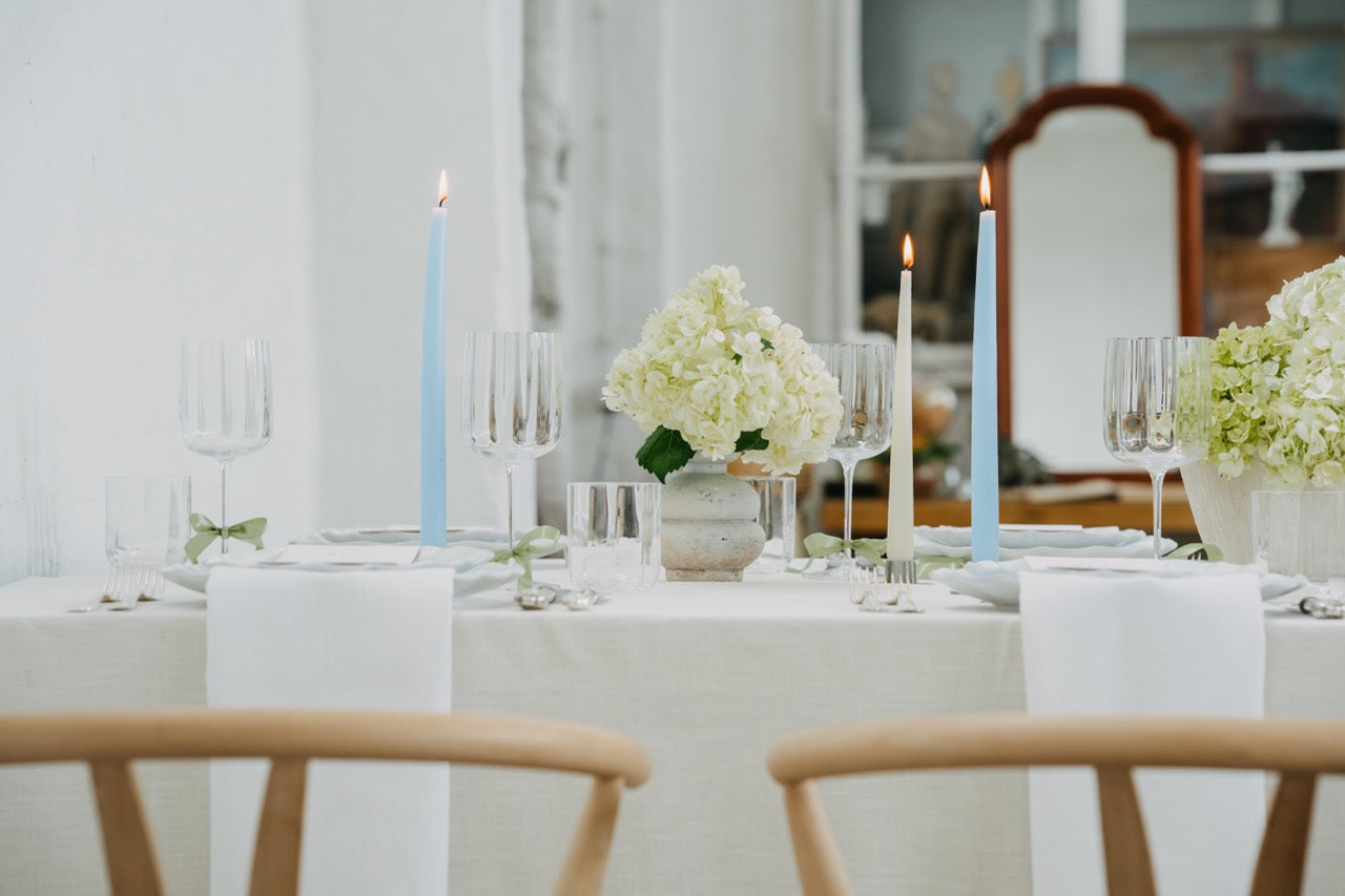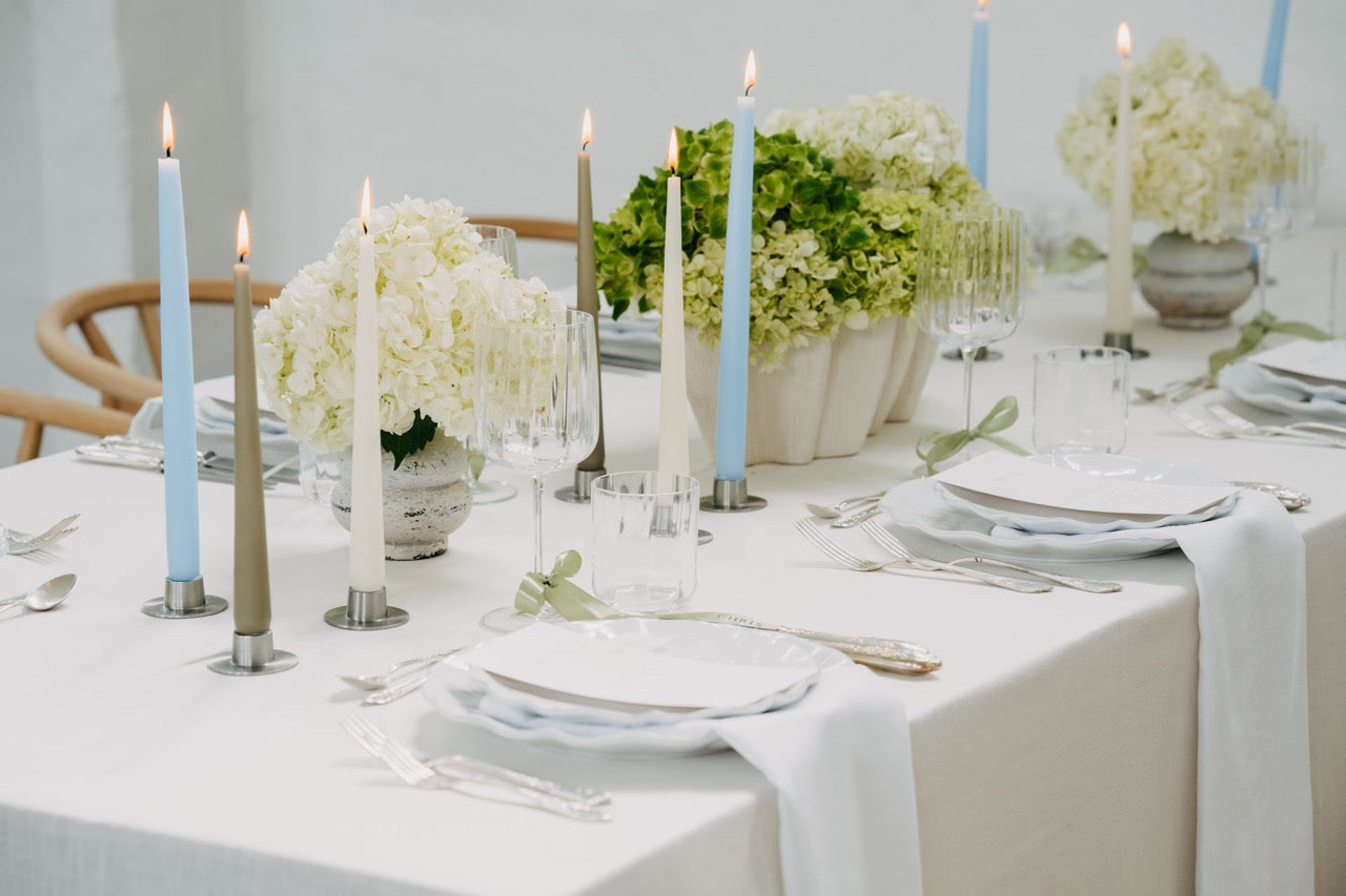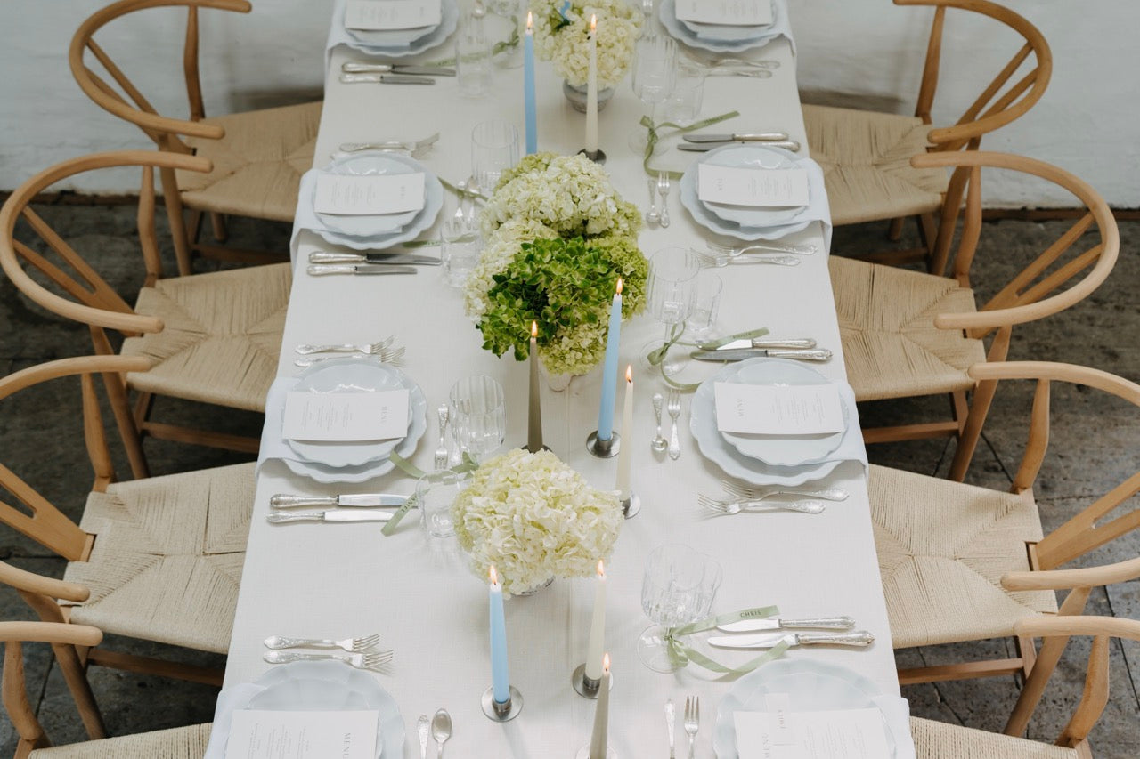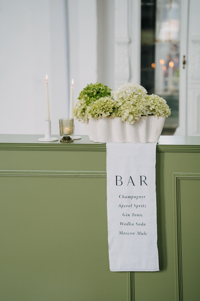 PURE steht für moderne Eleganz in ihrer klarsten Form. Der Look ist reduziert, durchdacht und dennoch voller Wirkung. Die harmonische Kombination aus frischem Weiß, sanftem Grünton und dezenten Akzenten in Pastellblau erzeugt ein ruhiges, fast schwereloses Gesamtbild. Opulente Hortensien in abgestimmten Gefäßen treffen auf gradlinige Kerzenhalter und zarte Texturen – alles wirkt leicht, stilvoll und ausgewogen. Dieses Konzept lebt von seiner minimalistischen Raffinesse und der Kunst, mit wenigen, hochwertigen Elementen eine besondere Atmosphäre zu schaffen. PURE fühlt sich aufgeräumt, luftig und gleichzeitig besonders an – perfekt für alle, die sich nach Klarheit, Stil und feiner Zurückhaltung sehnen.