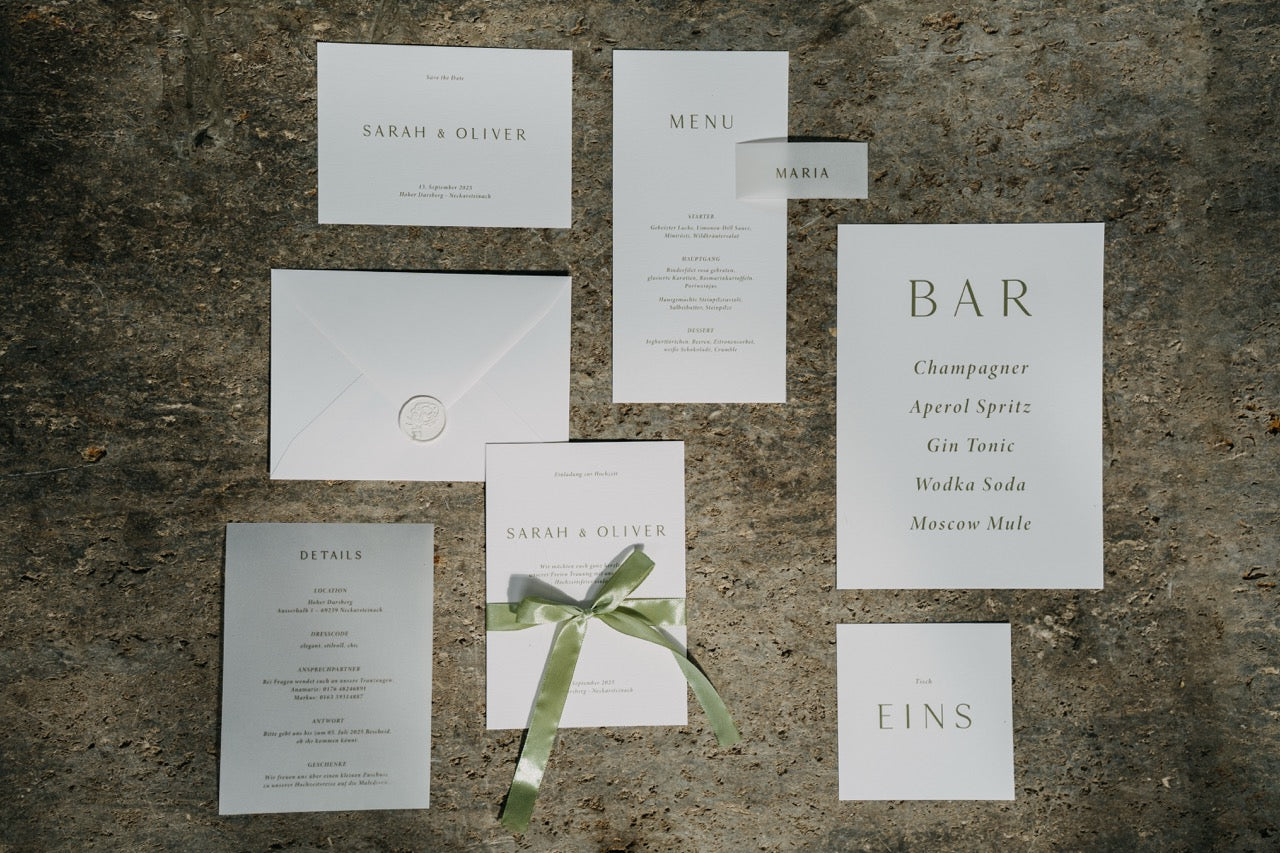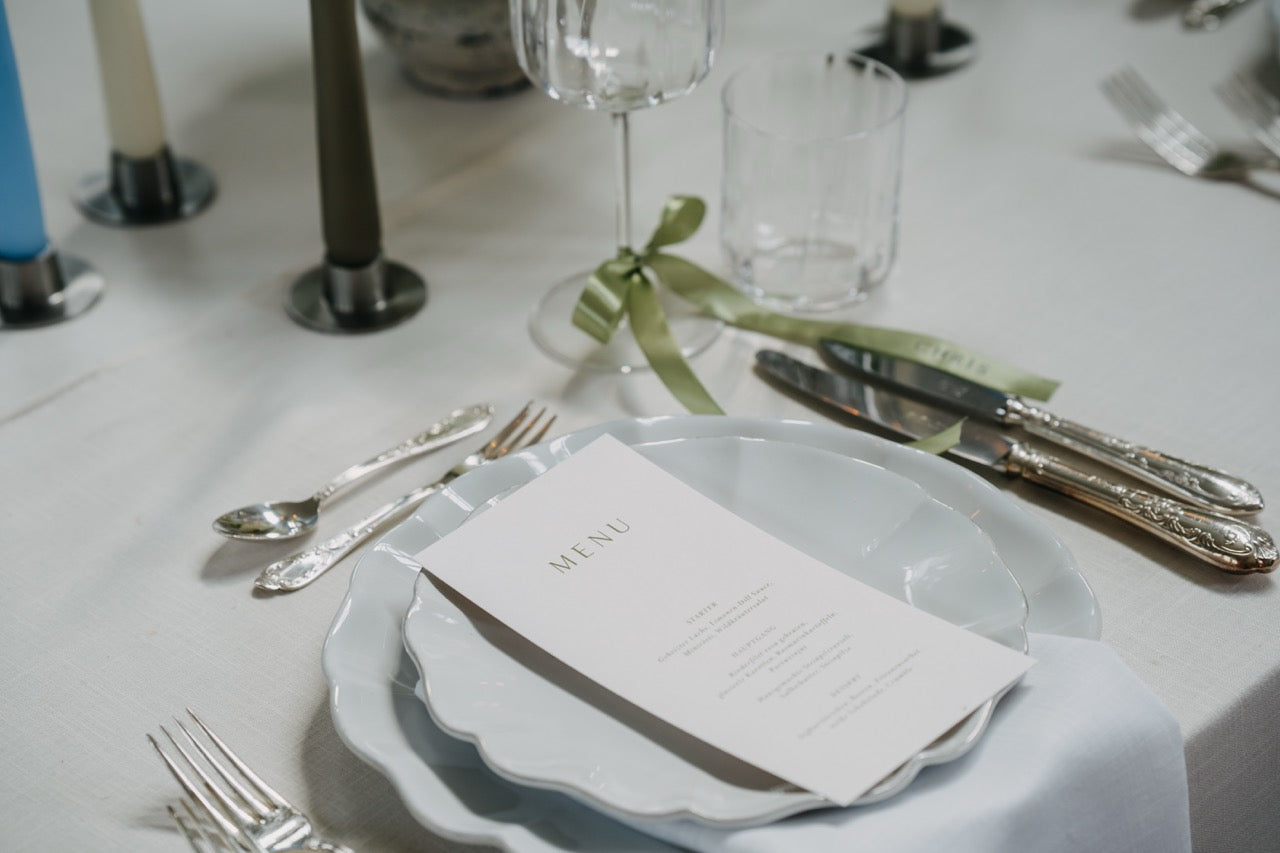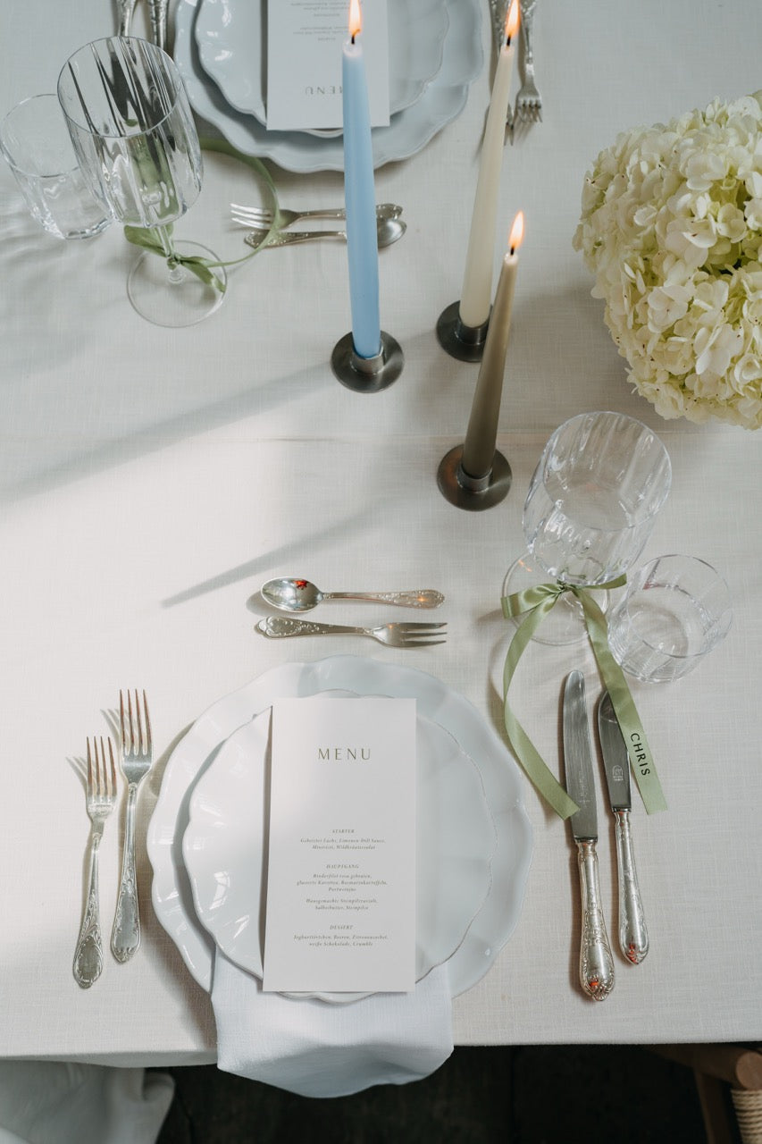 Für die Umsetzung dieses Konzepts solltet Ihr mit Kosten ab 72€ pro Person rechnen. Hier sind alle Elemente der Tischdekoration wie Floristik, Papeterie, Kerzen, Geschirr, Besteck und Tischwäsche enthalten. Weitere Komponenten wie Mobiliar oder besondere Extras sind im Guide verlinkt, aber nicht in diesem Preis enthalten.